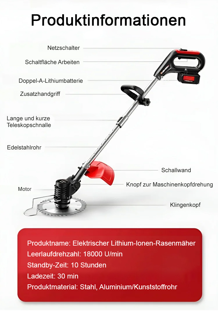 【30 Jahre verwendbar】Tragbarer Gartenrasenmäher mit Lithiumbatterie